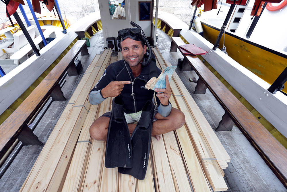 A novidade veio dar quase na praia. Desde a manhã do domingo, dia 20, uma quantia indefinida de numerário foi vista boiando nas águas sujas da Baía, às margens do bairro da Urca. O cardume de papel-moeda era formado por cédulas de valores graúdos, 50 e 100 reais. Não deu outra: a turma lançou-se ao mar atrás da grana. Alguns se aventuraram a bordo de embarcações de tamanhos variados, outros com equipamento de mergulho profissional. Houve até quem tentasse a sorte de roupa e tudo, carteira e celular no bolso — caso de Alex Conceição, flagrado em reportagem de Clarissa Monteagudo e Júlia Cople publicada no jornal Extra. Alex voltou para casa de bolsos molhados e vazios, provavelmente porque começou tarde a caça ao tesouro, na terça (22). A ele, juntaram‑se pessoas de todos os cantos que, ao saber da notícia, foram tomadas de súbito amor pela pescaria. A concentração de gaiatos, curiosos e desesperados atrás de dinheiro fácil deu-se no ponto conhecido como Quadrado da Urca, atracadouro transformado em santuário ecológico da nova e rara atração aquática. Quem esbarrou com o fenômeno no início está comemorando. Roberto Pereira é pescador, categoria não exatamente famosa pela fidelidade de suas histórias, mas, exultante, contou ter resgatado 45 000 reais no domingo. Depois de nadar em dinheiro, comprou material para reformar seu barco. Houve quem retornasse à terra firme com até 10 000 reais. A origem das cédulas, em parte já se esfacelando depois do contato com a água salgada, ainda era ignorada até meados da semana. Na base da gozação, surgiram palpites como “deu a louca em um velho militar” e “veio no esgoto do Cabral”. Não faltou quem lembrasse da oferenda a Iemanjá feita pelo empresário Eike Batista, no último 2 de fevereiro, mas o acerto entre o ex-bilionário e a rainha dos mares aconteceu longe dali e em moedas de ouro. Todo mundo, no final das contas, deu um jeito de, ao menos, se divertir um pouco. A ajuda, em tempos de crise, vem dos lugares mais improváveis.