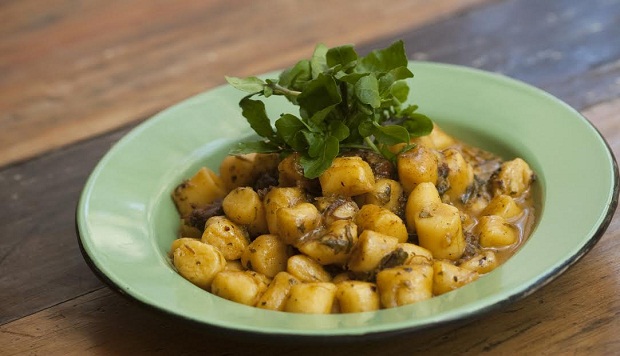 Prato principal: Ravióli de cordeiro com manteiga queimada e menta, polvilhado com farinha de amêndoas e castanha ou Nhoque de abóbora com pesto de manjericão