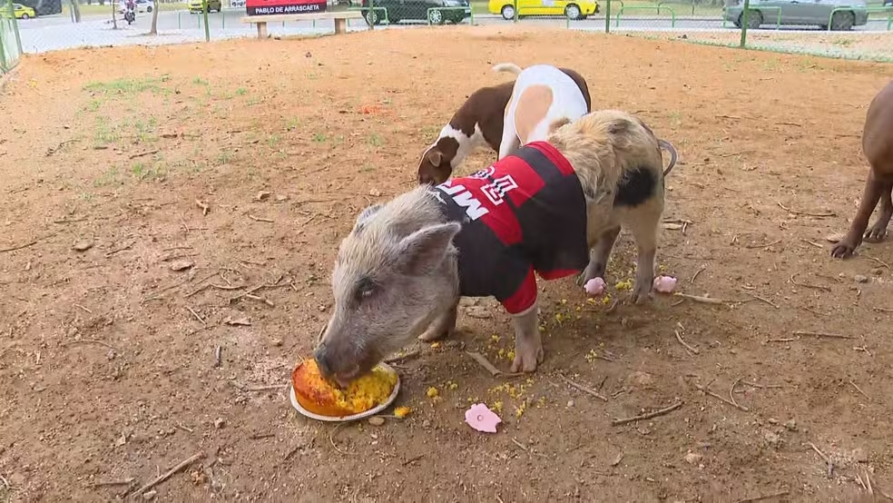 No meio dos cães, em passeio matinal pelas ruas com o adestrador, havia um porquinho. Já famoso entre seus seguidores na internet, por sinal, com nome de craque do Flamengo e vestindo a camisa do clube. O suíno Pablo de Arrascaeta completou dois anos de vida nesta quarta (9), e sua “festa” de aniversário fez sucesso na internet.