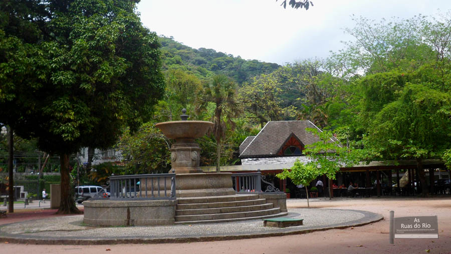 O charmoso chafariz do francês Grandjean de Montigny no centro da Praça Afonso Vizeu. Ao fundo, o restaurante Bar da Pracinha, referência gastronômica no Alto.