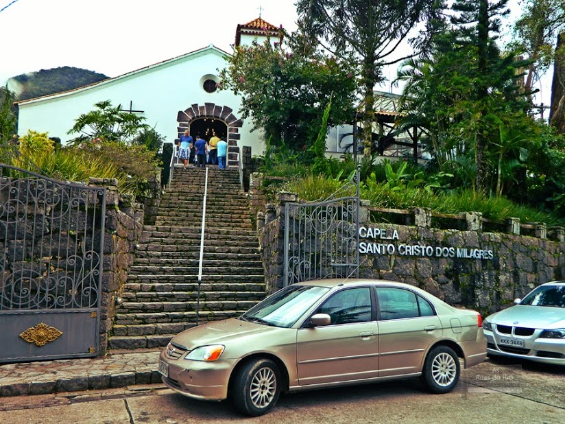 Quando chegamos lá (a primeira pessoa do plural se refere a mim e a minha família), fiz questão de checar o Google Maps do celular para me certificar em que “buraco” tínhamos nos metido. Meus pais já conheciam a praça e a capela graças a um casal de amigos recém-casados, porém eu e meu amigo tcheco, que fugiu do mestrado em São Paulo para desfrutar alguns dias em solos cariocas, ficamos surpresos em estar nesse bucólico refúgio. De imediato, percorremos o entorno da capela para observar melhor as residências da Estrada da Paz e da Estrada do Soberbo, que são vias adjacentes à Praça Martins Leão. Sem muitas perspectivas de enxergar além dos muros verdejantes, nos dirigimos à escadaria da capela.
