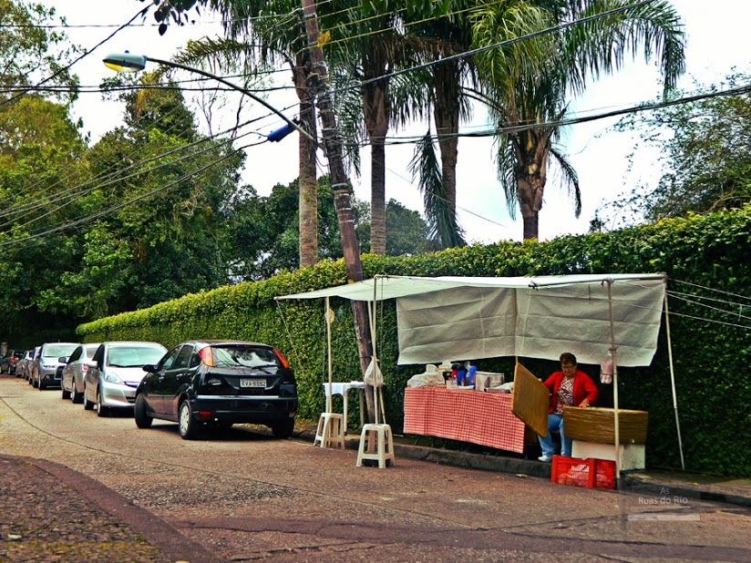 Como toda praça carioca que se preze, há o guardador de carros, que ultimamente designado, pejorativamente, de flanelinha. Na Praça Martins Leão, quem nos abordou foi um senhor muito simpático, no entanto, diferentemente daqueles flanelinhas que estamos acostumados a lidar nas ruas ao nível do mar. Além disso, a praça concentra dois pólos gastronômicos improvisados em tendas que protegem uma mesa com bules de café, condimentos, paninhos cobrindo outros produtos comestíveis e um isopor. Acredito que as duas senhoras que comandam essas cantinas ambulantes apareçam ali apenas nos horários mais badalados da igreja ou nos fins de semana.