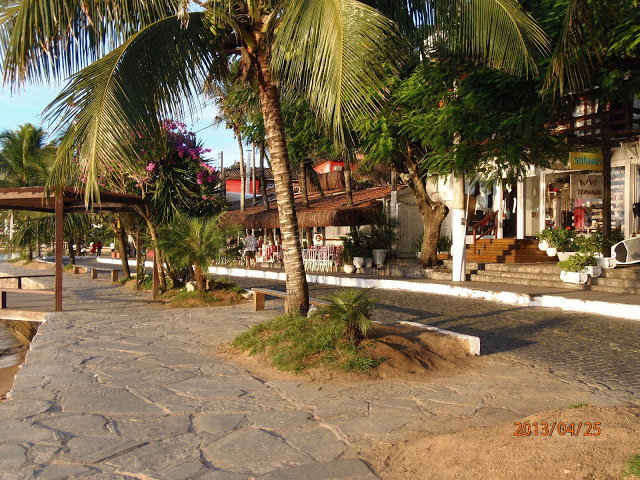 A rua de pedras separa o calçadão, com seus bancos e jardins, dos restaurantes, sorveterias e lojas.