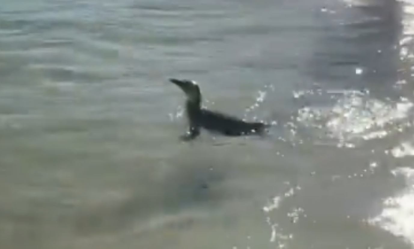 Depois das baleias, outro animal chamou a atenção nas praias do Rio. Um vídeo circulando nas redes sociais mostra um pinguim na transparente e gelada água da praia do Arpoador em meio a banhistas. A ave parece nadar despreocupada em dividir espaço com humanos.