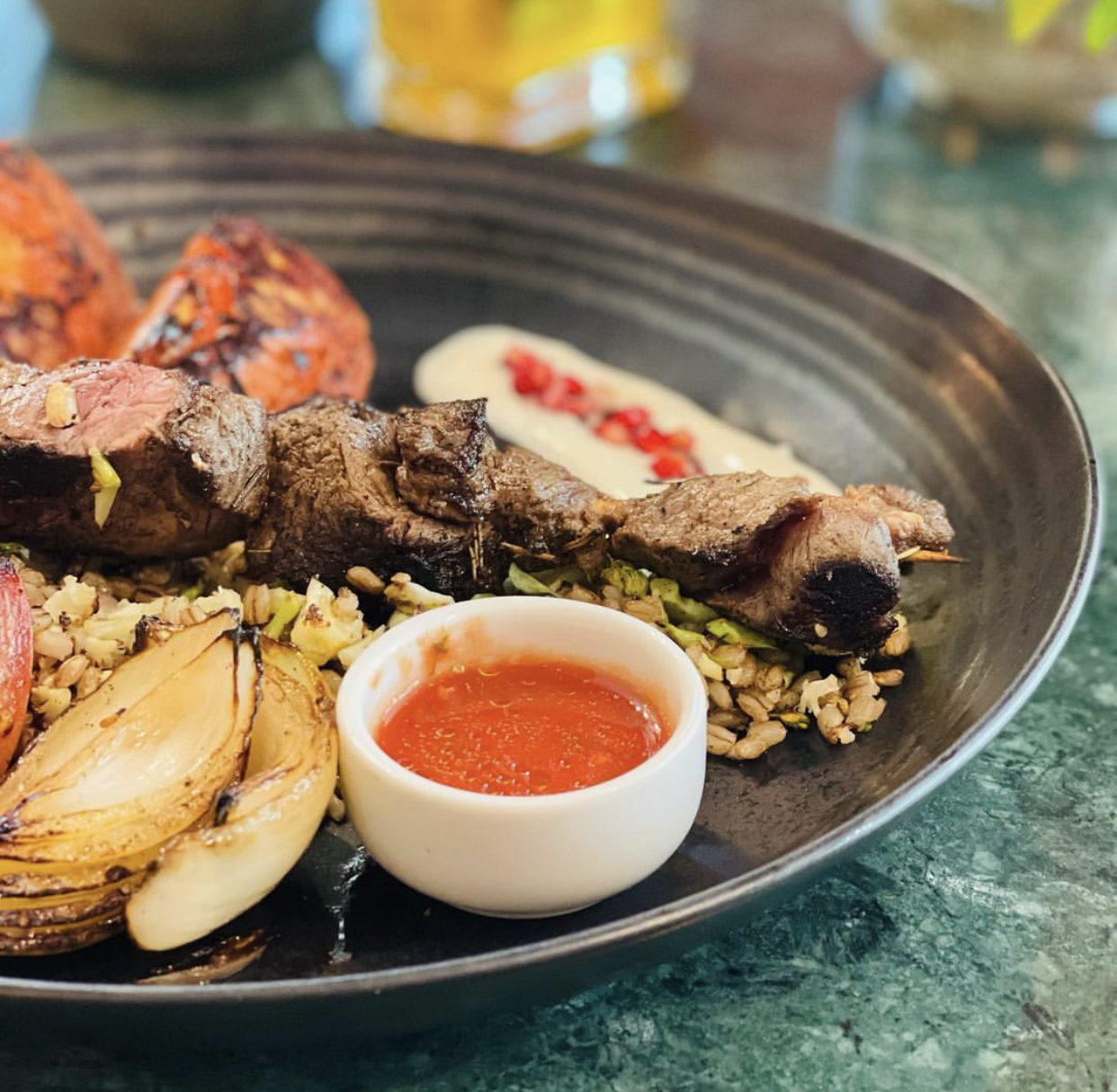 Definida pelos donos como um “bistrô árabe”, a casa destaca pedidas como a berinjela à moda israelense (R$ 41,00), cortada em cubos com azeite e especiarias, além de pão árabe. O cordeiro marroquino (R$ 88,00, individual) vem de principal, aromatizado com especiarias e ervas, servido com amêndoas laminadas e torradas sobre arroz marrakesch (açafrão-da-terra, grão-de-bico, salsa e castanha picada).