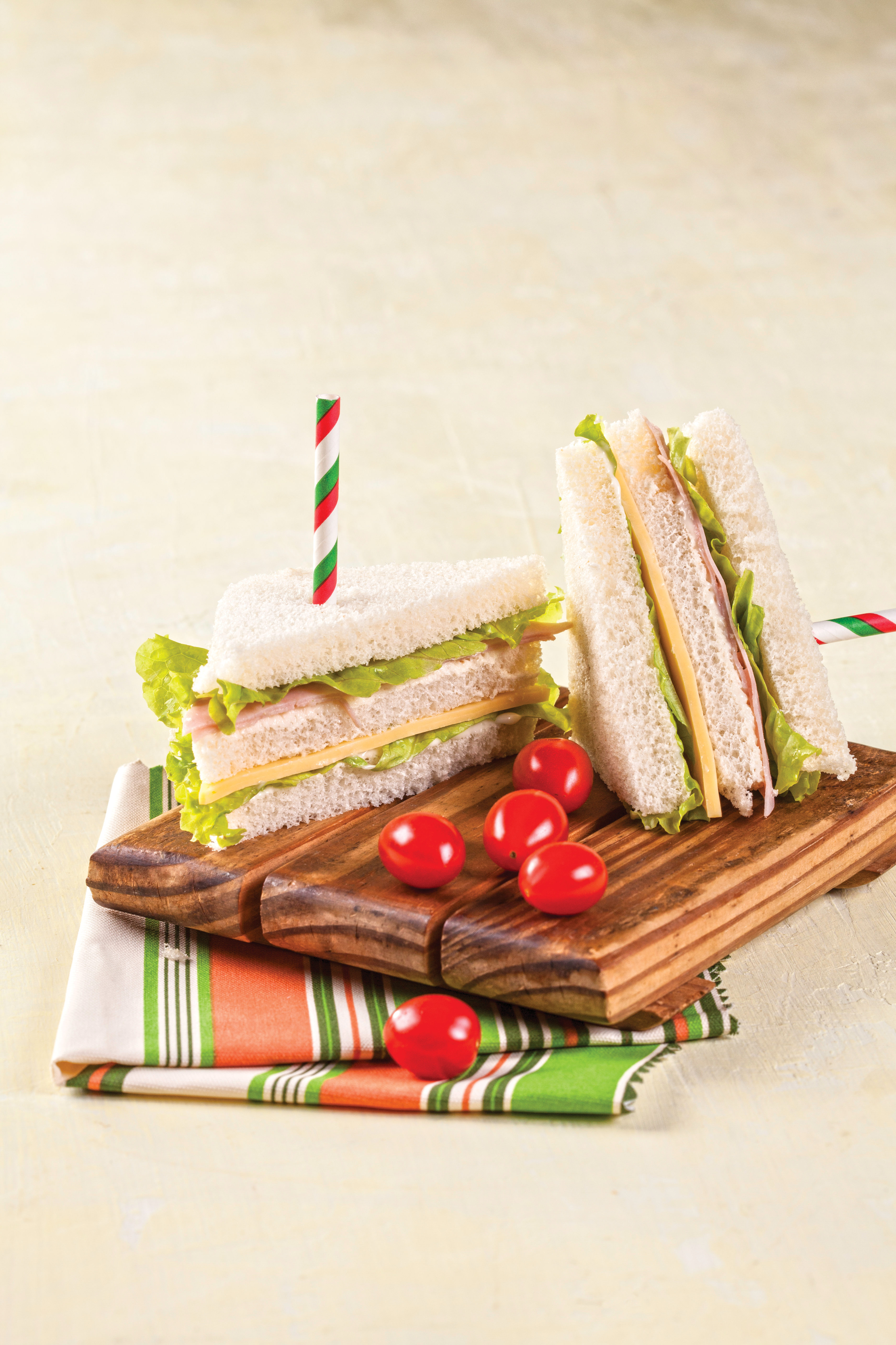 Passe a maionese em uma fatia de pão de forma. Cubra-a com uma folha de alface e uma fatia de presunto. Acrescente uma outra fatia de pão com maionese e cubra com alface e queijo prato. Finalize com uma fatia de pão de forma também com maionese. Para servir, corte o sanduíche na diagonal, empilhe uma metade sobre a outra e espete um palito para formar a torre. Repita esse procedimento com o restante dos ingredientes até construir 5 torres.