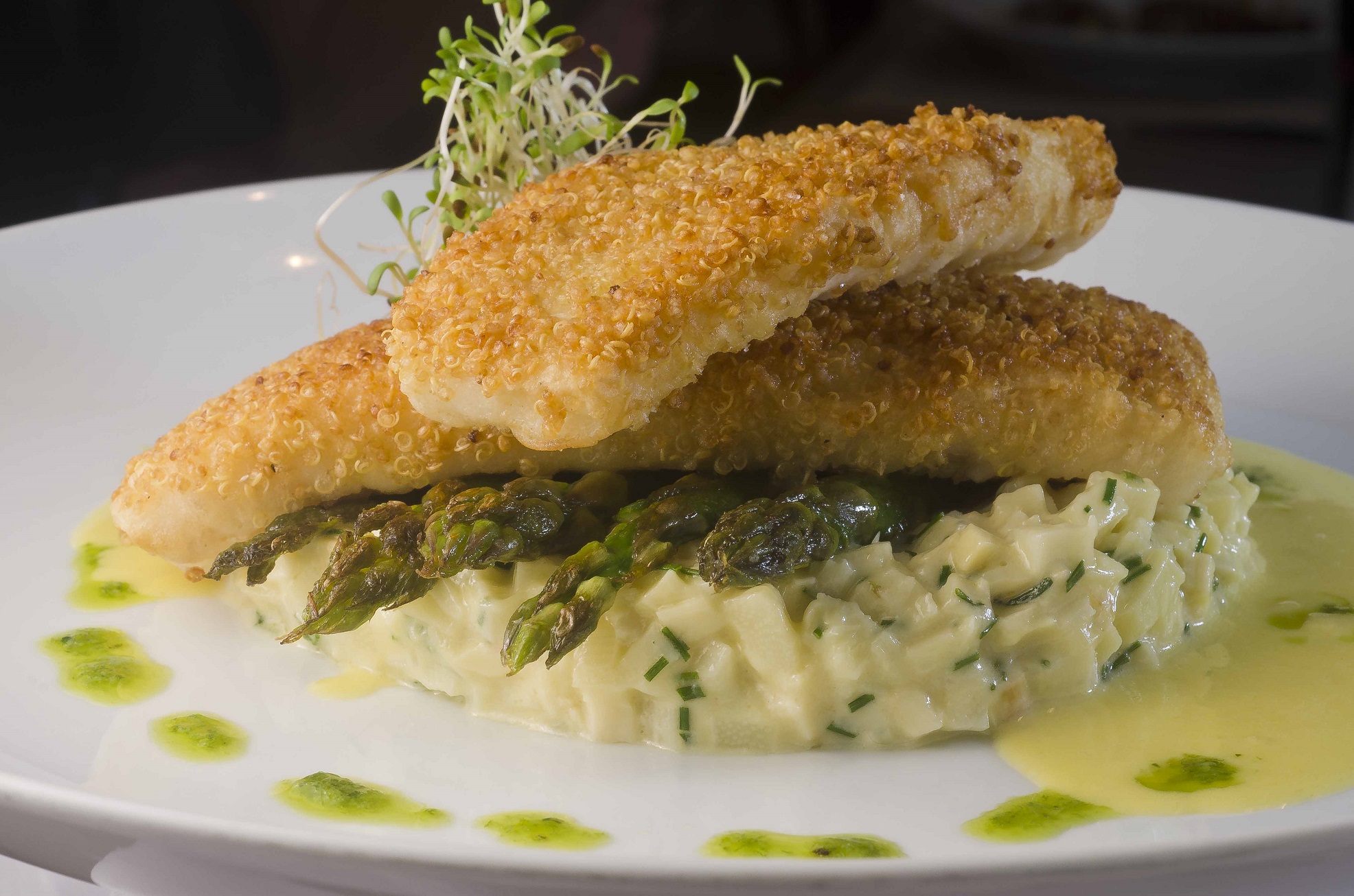 No cardápio da casa, que investe em pratos de preparo ligeiro, uma sugestão apetitosa traz filé de linguado em crosta de quinoa, guarnecido de palmito pupunha cremoso e aspargos (R$ 67,90).