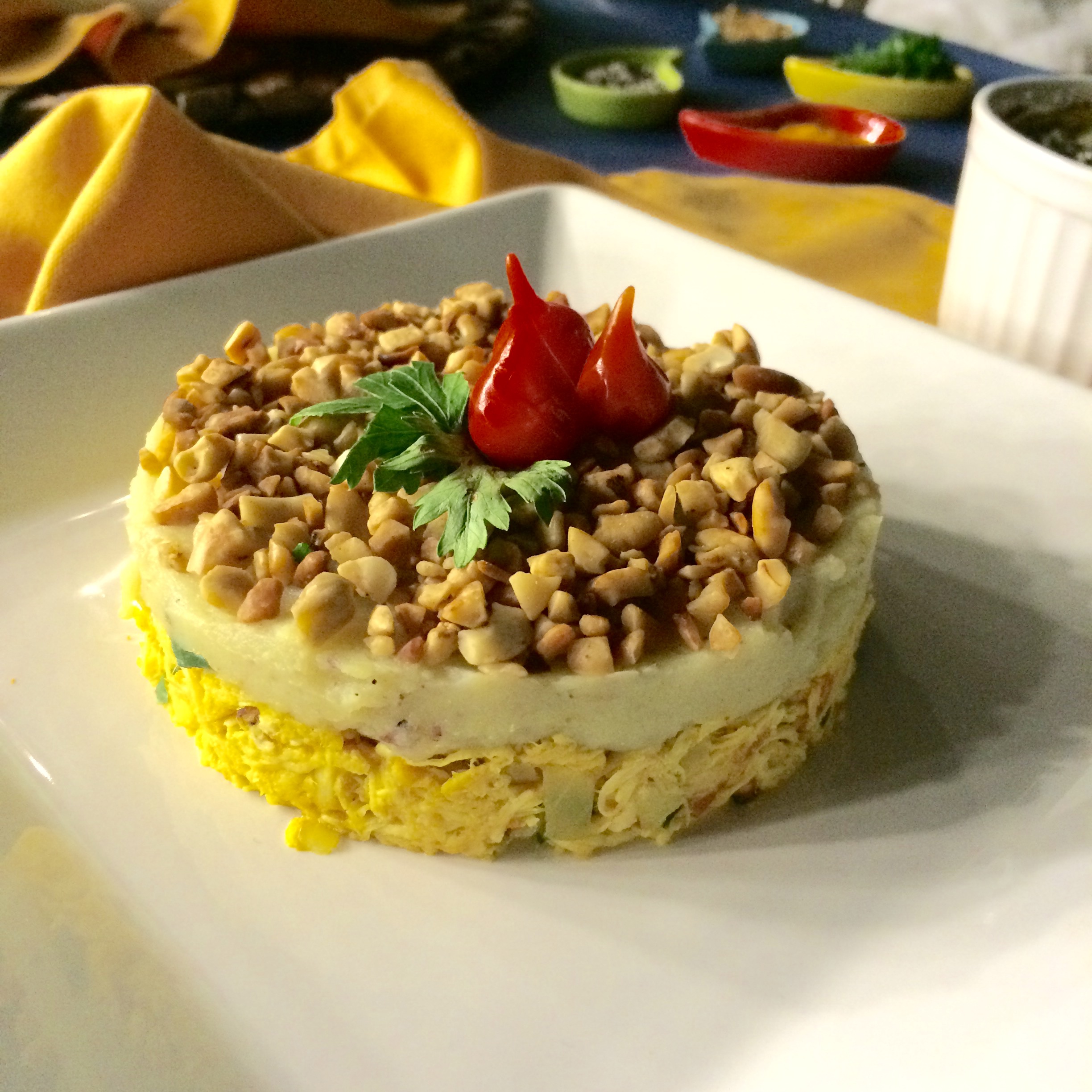 Em uma travessa, distribua o frango desfiado no fundo e depois cubra com o purê.