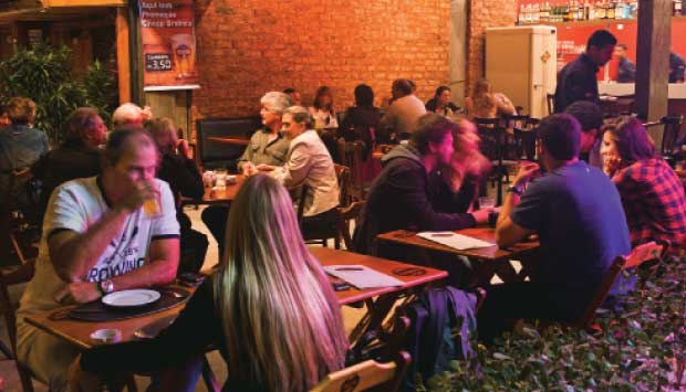 Há dois balcões nos fundos da casa. Um deles abriga a chopeira que enche caldeiretas de gelado chope Brahma (R$ 3,50) e no outro são preparados drinques clássicos, como o kir royal (R$ 14,90). Servida no copo de 500 mililitros, a caipivodca de maracujá (R$ 11,90) surpreende mais pelo tamanho.