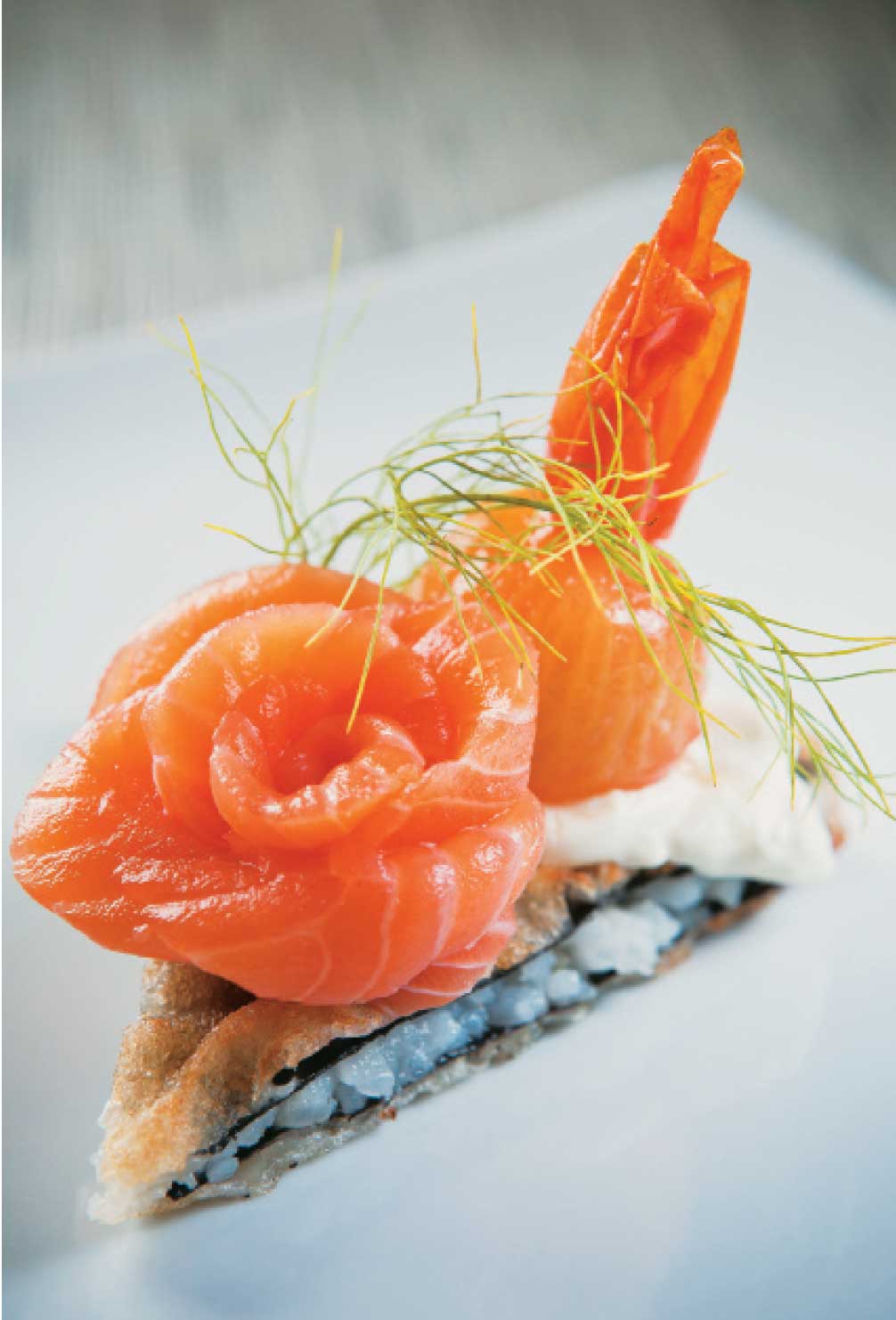 Na entrada, delicados rolinhos de papel de arroz (R$ 12,00, quatro unidades) ganham recheios diversos. Novidade, a hara pizza (R$ 12,00) atiça a curiosidade. Trata-se de um triângulo de arroz, o equivalente à fatia da redonda, em crocantes folhas de alga, sob coberturas engenhosas. Entre as sete combinações figura uma apetitosa versão de shiitake e chips de gengibre. Na ala conservadora do cardápio, a bancada de peixes crus abastece a tradicional família de sushis, sashimis e enrolados. A criativa índole do chef, no entanto, não dispensa um menu degustação (R$ 70,00, quatro pratos, ou R$ 20,00, cada receita). Nesse caprichado percurso, começamos por petiscos de salmão e atum. No topo de cada peça, abacaxi, maracujá, nozes e foie gras.