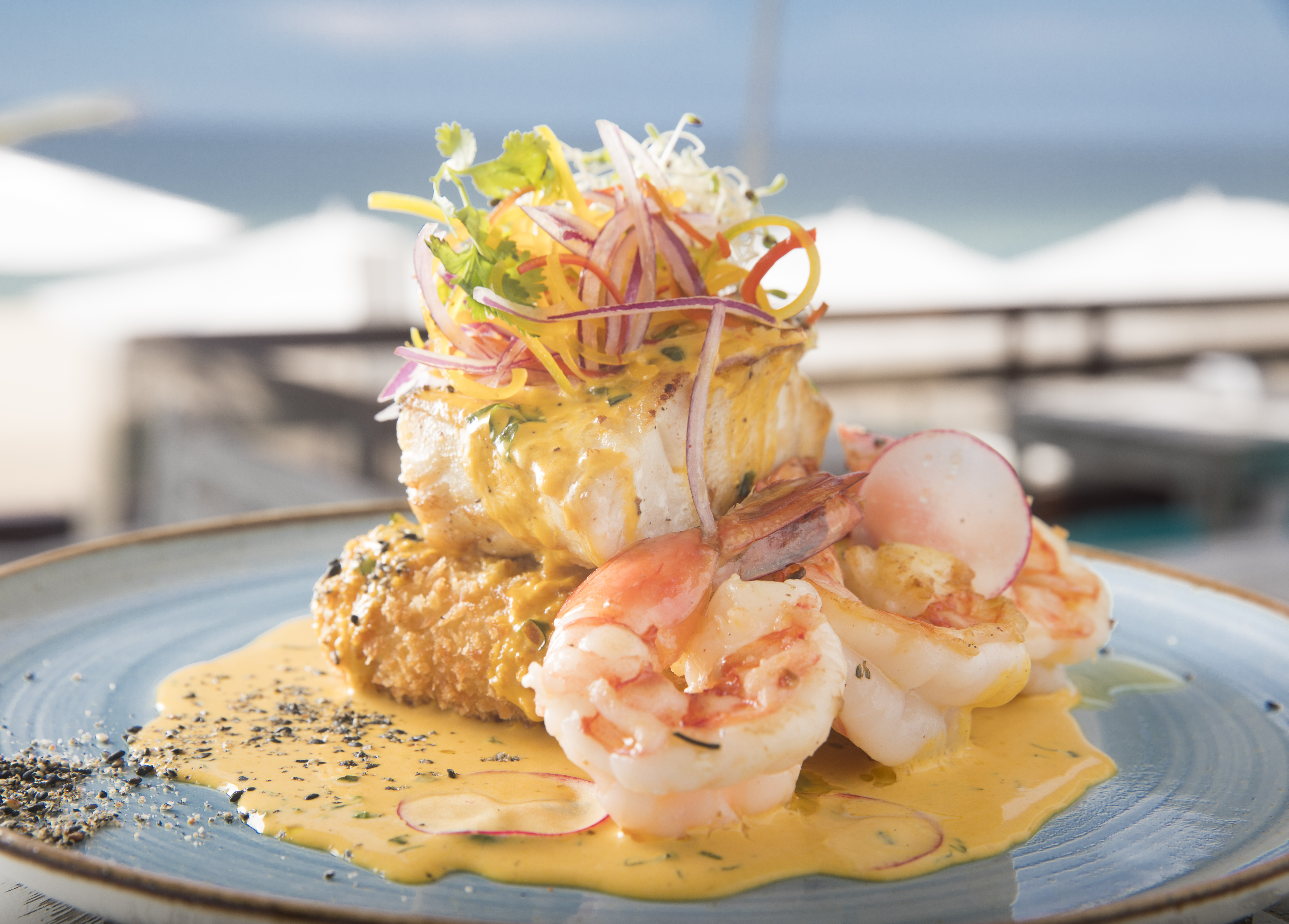 Prato principal: Peixe e camarão grelhados e guarnecidos de croquete de aipim com gruyère, molho de dendê com açafrão e saladinha de brotos (R$ 74,90)