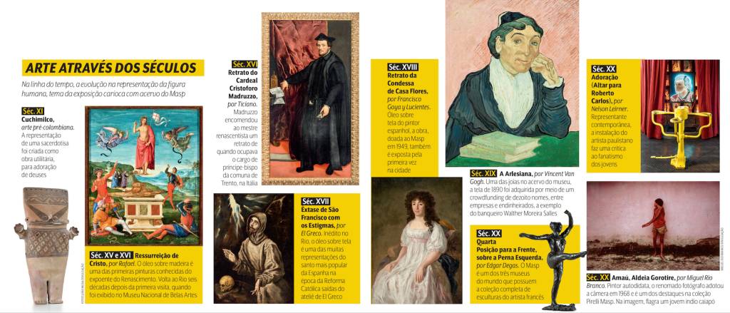 Na montagem que ocupará o 1º andar do movimentado CCBB, no Centro, Rafael vai estar ao alcance do público, de graça, ao lado de obras icônicas da Europa pré-renascentista, a exemplo de Virgem com o Menino Jesus, atribuída a Maestro di San Martino alla Palma, pintor italiano de Florença, do início do século XIV, e Cristo Morto no Sarcófago Como Vir Dolorum, criada por Niccolo di Liberatore entre 1480 e 1500. A seleção de 100 obras inclui outros nomes de peso, a exemplo do flamengo Anthony van Dyck, retratista da corte real de Carlos I da Inglaterra, e do pintor espanhol Francisco Goya y Lucientes, autor do Retrato da Condessa de Casa Flores (1790-1797), no Rio pela primeira vez. Ecos do Iluminismo no Brasil ganham espaço na exposição com dois expoentes da pintura acadêmica nacional do século XIX, Henrique Bernardelli e José Ferraz de Almeida Junior. Há muito mais, como comprova o “dream team” reunido na ala dedicada à arte moderna: Paul Cézanne, Pablo Picasso, Vincent van Gogh, Paul Gauguin e Amedeo Modigliani, além dos brasileiros Anita Malfatti e Candido Portinari.