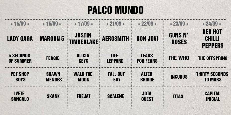A sétima edição do festival no Rio acontece nos dias 15, 16, 17, 21, 22, 23 e 24 de setembro, no Parque Olímpico, na Barra da Tijuca, onde será montada a nova Cidade do Rock, em uma área com o dobro de tamanho da anterior. A venda de ingressos para o público geral começa nesta quinta-feira, 6 de abril.