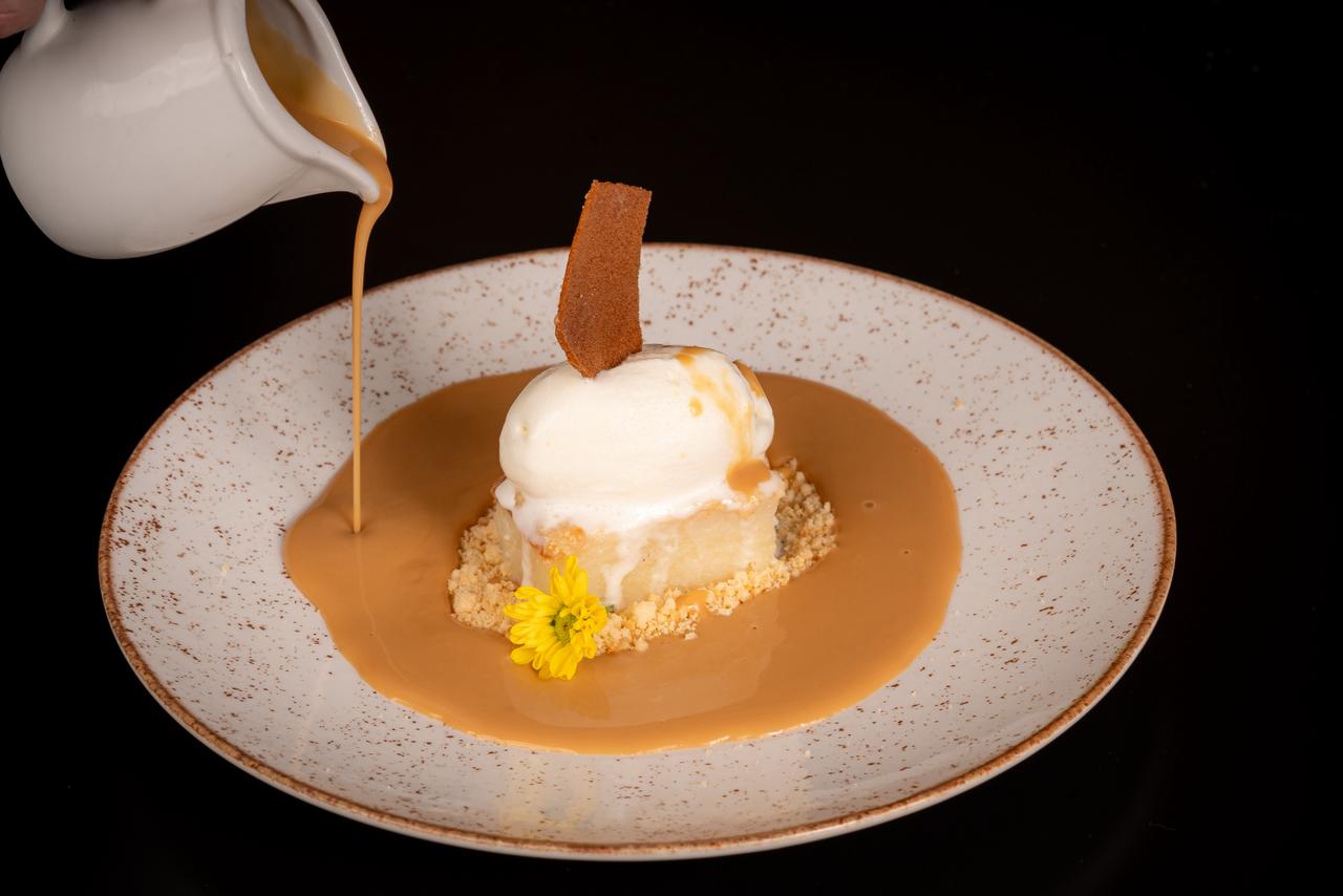 Criado pela avó da chef para o bisneto Pedro, que não podia comer açúcar, o bolo, numa nova versão, hoje leva calda de doce de leite e tuille de coco